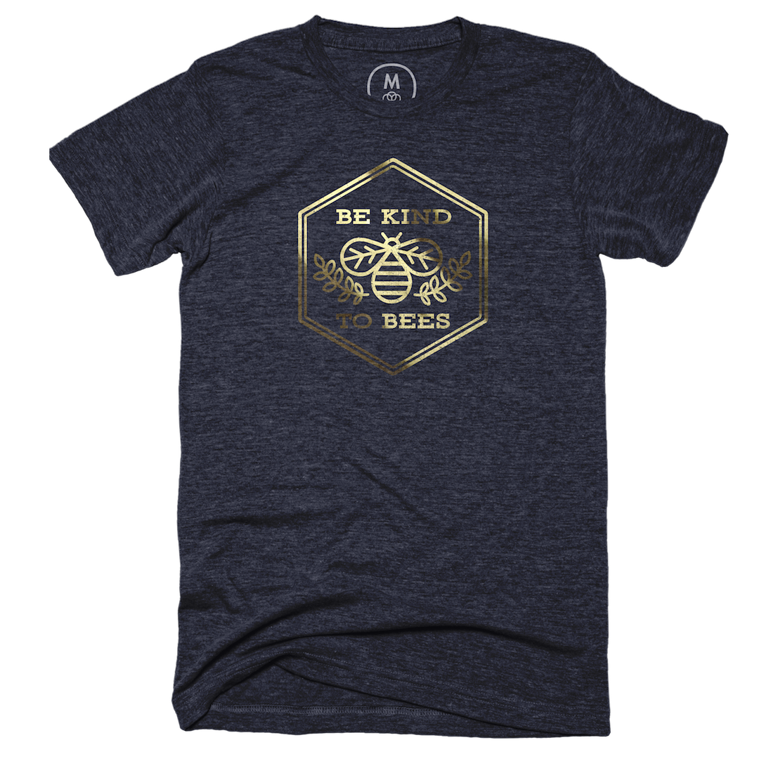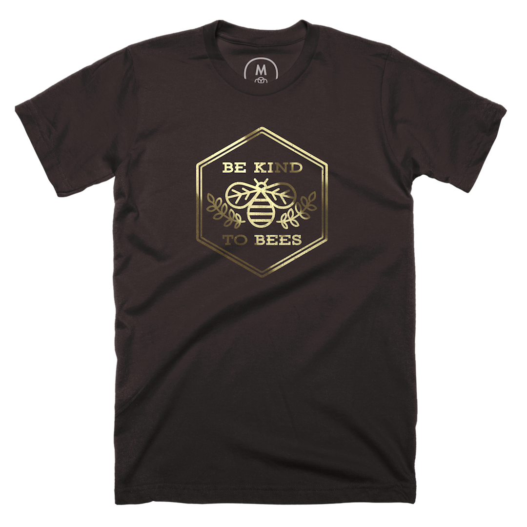 T-shirt design printed in gold foil for Cotton Bureau. https://cottonbureau.com/products/be-kind-to-bees