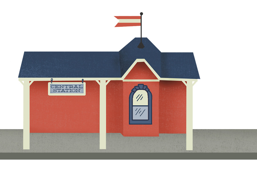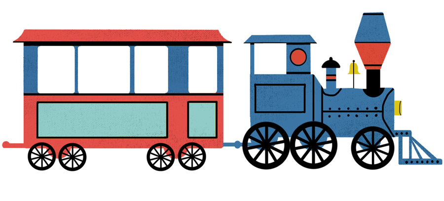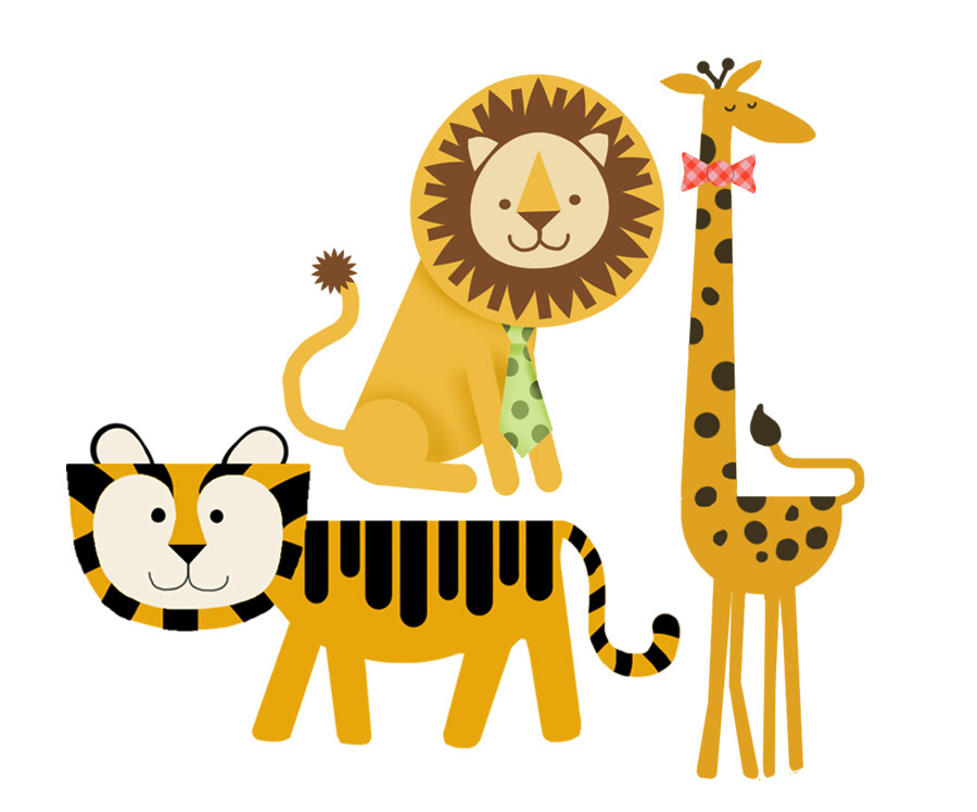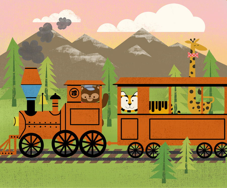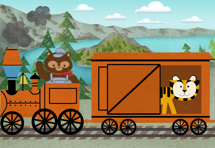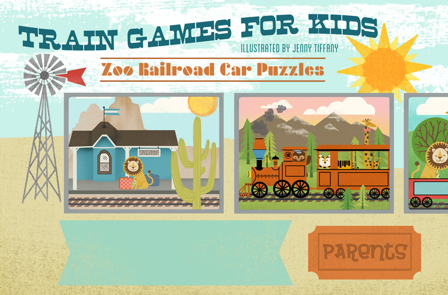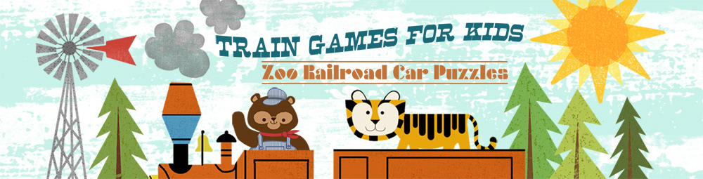 Background illustrations, character design illustrations, title and credits page design, and button assets for a Zoo Train Puzzle app for children.